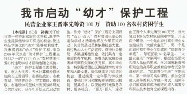“幼才”保護(hù)工程由全國(guó)勞模、省、市人大代表,天水計(jì)算機(jī)專修學(xué)院院長(zhǎng)王晉倡導(dǎo),市委統(tǒng)戰(zhàn)部、市教育局、市慈善總會(huì)、市工商聯(lián)、市婦聯(lián)、市建設(shè)學(xué)習(xí)型城市發(fā)展戰(zhàn)略研究會(huì)共同發(fā)起,從今年開(kāi)始正式啟動(dòng)實(shí)施。作為“幼才”保護(hù)工程分支項(xiàng)目的“百萬(wàn)·百人”農(nóng)村貧困生愛(ài)心傳遞助學(xué)成才活動(dòng)也將在今年正式啟動(dòng),其目的是動(dòng)員和依靠社會(huì)力量,通過(guò)熱心人士廣泛宣傳,獲得社會(huì)捐助,多渠道籌措資金,依托具有一定資質(zhì)的辦學(xué)機(jī)構(gòu),免費(fèi)為因家庭經(jīng)濟(jì)困難而面臨失學(xué)的優(yōu)秀初、高中畢業(yè)生,特別是貧困山區(qū)瀕臨輟學(xué)的青少年和大齡女童,提供繼續(xù)學(xué)習(xí)深造的機(jī)會(huì),通過(guò)接受一定年限的學(xué)校教育,使他們學(xué)習(xí)和掌握更多的知識(shí)技能,促其成才,以便能更好地服務(wù)農(nóng)村、服務(wù)社會(huì)!鞍偃f(wàn)·百人”活動(dòng)由王晉個(gè)人率先籌資100萬(wàn)元,首批資助100名農(nóng)村家庭困難學(xué)生,開(kāi)設(shè)兩個(gè)班級(jí),一個(gè)是由農(nóng)村高中畢業(yè)女生組成的“大齡女童班”,另一個(gè)是由農(nóng)村初中畢業(yè)生組成的“優(yōu)智青少年班”,每班招收50名學(xué)生!按簖g女童班”學(xué)制兩年。根據(jù)市場(chǎng)需求和用人單位的要求,學(xué)習(xí)國(guó)家教育部所規(guī)定的高等職業(yè)教育自學(xué)考試全部課程內(nèi)容。“優(yōu)智青少年班”學(xué)制三年。第一年學(xué)習(xí)高中課程,參加全國(guó)成人高等教育入學(xué)統(tǒng)一考試;后兩年學(xué)習(xí)國(guó)家教育部所規(guī)定的成人高等?坡殬I(yè)技術(shù)教育全部課程內(nèi)容。