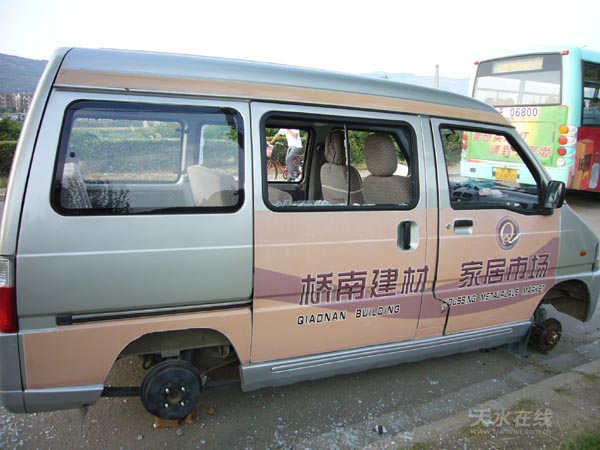 6月22日下午,天水市麥積橋南建材市場免費直通車在行至天水市秦州區(qū)濱河東路時,被天水市羲通公交公司員工強行攔住,他們一擁而上,砸碎了該車車窗玻璃,并卸掉了四個車輪。6月26日,記者接到橋南建材市場購物免費直通車司機的反映后,前往天水羲通公交公司進行了調查采訪。