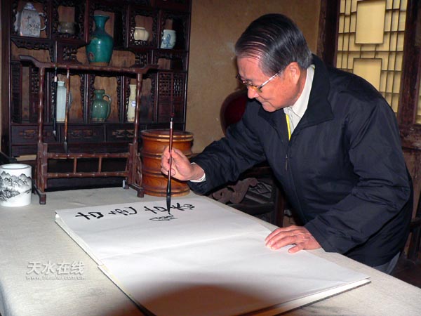 圖為中國(guó)國(guó)民黨中央評(píng)議委員會(huì)主席團(tuán)主席、世界客屬總會(huì)榮譽(yù)會(huì)長(zhǎng)饒穎奇為南宅子揮毫獻(xiàn)墨寶。