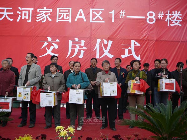 10月30日下午的天河家園,鑼鼓喧天,禮花繽紛,隨著該小區(qū)一期工程1至8號樓的如期交付使用,40多位藉河工程拆遷戶欣喜地拿到了首批新房鑰匙。