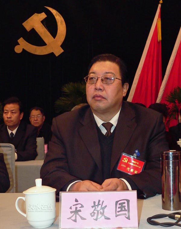 宋敬國 男,漢族,1952年10月出生,甘肅省定西縣人,中共黨員。1972.12-1976.4,在部隊股役,任團報道組報道員;1976.4-1976.12,在定西縣稱鉤鄉(xiāng)白楊村任村副主任;1976.12-1984.6,在定西縣委宣傳部任干事、副部長;1983.3-1986.6,在定西地委秘書處任秘書科副科長、科長;1986.6-1993.2,在定西地委任副秘書長,政策研究室副主任;1993.2-2000.4,在定西地區(qū)行署任辦公室主任;2000.4-2000.8,在定西地委任秘書長;2000.8-2001.12,任定西地委委員、地委秘書長;2001.12,任中共天水市委副書記。
