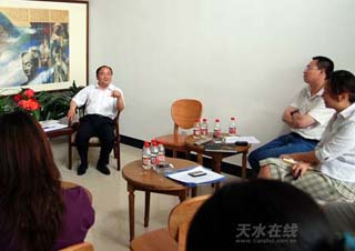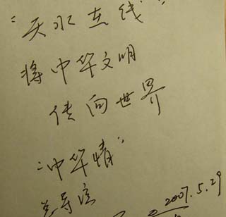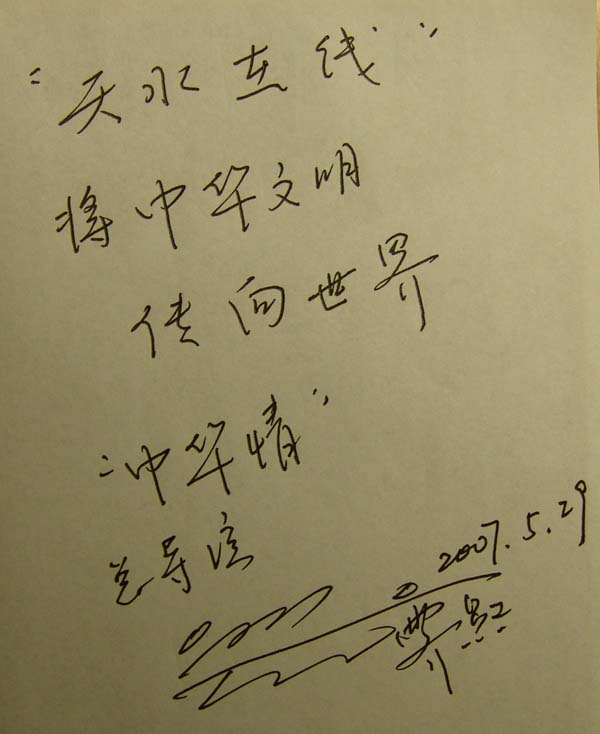天水在線訊 5月29日下午,“中華情·相約天水——2007(丁亥)年中國(guó)天水伏羲文化旅游節(jié)“天河春”之夜慶典晚會(huì)”新聞發(fā)布會(huì)在天水市陽(yáng)光飯店舉行,新聞發(fā)布會(huì)結(jié)束后,“中華情”總導(dǎo)演郭霽紅欣然為天水在線題詞。