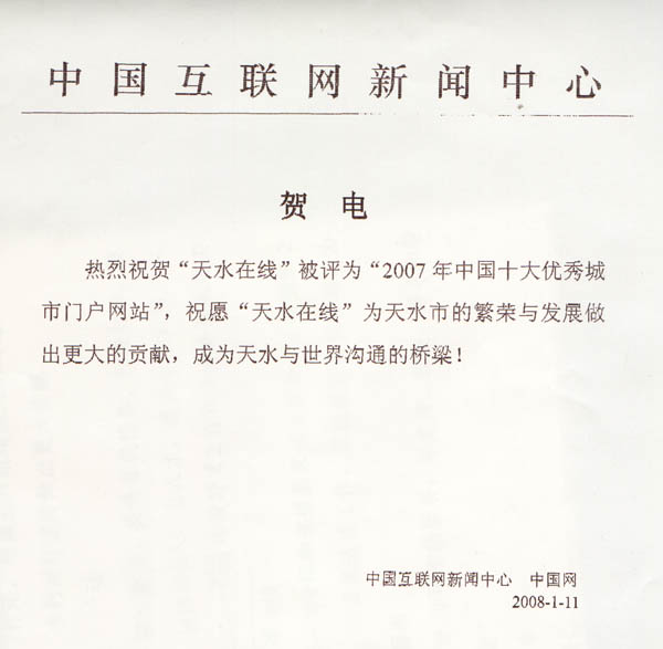 天水在線被評(píng)為“2007中國十大優(yōu)秀城市門戶網(wǎng)站”