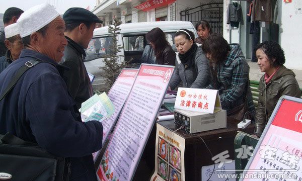 為了提高廣大婦女的法律素質(zhì),增強(qiáng)全社會(huì)維護(hù)婦女兒童合法權(quán)益、維護(hù)社會(huì)穩(wěn)定的公眾意識(shí),張家川縣婦聯(lián)協(xié)同縣司法局、民政局、衛(wèi)生局、社保局、工會(huì)、團(tuán)委、禁毒辦等單位,聯(lián)合開(kāi)展慶“三八”婦女“維穩(wěn)維權(quán)”宣傳、咨詢、服務(wù)活動(dòng),利用三月八、九、十號(hào)三天時(shí)間在有集市、群眾集中的鄉(xiāng)鎮(zhèn)懸掛橫幅、啟動(dòng)巡回宣傳車、設(shè)法律咨詢點(diǎn)、發(fā)放宣傳材料等形式,廣泛開(kāi)展《婦女權(quán)益保障法》、《勞動(dòng)法》、《未成年保護(hù)法》、《勞動(dòng)合同法》、《婚姻登記條例》等法律法規(guī)的宣傳咨詢服務(wù)活動(dòng)。