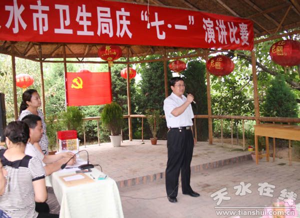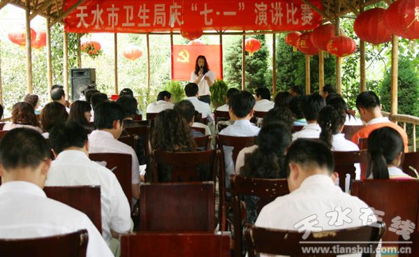 為紀念建黨88周年, 進一步深化對學習實踐科學發(fā)展觀活動的思想認識,引導機關干部職工從自身和本職崗位出發(fā),為推進衛(wèi)生事業(yè)科學發(fā)展積極思考、獻計獻策,天水市衛(wèi)生局在七一來臨之即開展了以“黨員干部受教育、衛(wèi)生事業(yè)上水平,人民群眾得實惠”為主題的演講比賽。