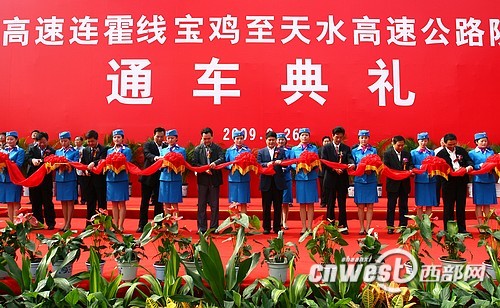 2009年9月26日上午,寶雞市寶天高速公路陳倉主線收費站廣場彩旗飄揚,鑼鼓喧天,國家高速連霍線寶雞至天水高速公路陜西段通車典禮在這里隆重舉行,陜甘兩省高速公路實現(xiàn)對接,制約關中-天水經(jīng)濟區(qū)發(fā)展的高速公路瓶頸被成功打破,關中-天水經(jīng)濟區(qū)的發(fā)展駛入快車道。