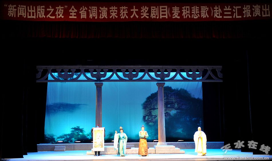 在2009年甘肅省慶祝新中國成立60周年新創(chuàng)劇目調(diào)演活動中,由天水市秦劇團(tuán)和天水市歌舞團(tuán)聯(lián)合創(chuàng)排的大型歷史秦劇《麥積悲歌》,以其大氣厚重的創(chuàng)作、雅俗共賞的唱詞、優(yōu)美感人的唱腔、飽滿鮮明的人物形象、跌宕起伏的劇情設(shè)計、富有現(xiàn)代活力的藝術(shù)表現(xiàn)形式、鮮明的地方特色而榮獲劇目大獎!尔湻e悲歌》的戲劇故事可謂凄婉壯美,它以南北朝西魏時期的政治斗爭為故事背景,以麥積山第44號洞窟乙弗氏塑像的傳說為素材,成功地挖掘了天水厚重的歷史文化,將大地上一個偏僻角落的故事敘說為一出感動人心的悲劇,表現(xiàn)出編劇獨具的慧眼。同時,編劇慧思獨具地將乙弗氏與麥積山石窟中那尊“東方維納斯”坐佛雕像通過一幅觀音圖聯(lián)系起來,構(gòu)思極為成功。而體現(xiàn)這一構(gòu)思的樞紐型人物,就是畫師皇甫鴻。他是本劇中唯一一個代表著世俗生活的平民形象。本劇中其他的人物,要么是宮廷中人(大俗之人),要么是寺庵中人(出俗之人),而皇甫鴻則非官非僧,是一個民間的畫師,他代表了劇中除政治的力量、宗教的力量之外的第三種力量:世俗生活的力量,代表著人間的真情、人生的自由與平民的幸福。他幾乎成為被宮廷拋棄不得不寄身山寺的乙弗氏的拯救者:當(dāng)乙弗氏和他在麥積山偶遇,他的出現(xiàn)勾起了乙弗氏純真美好的回憶,劇情也在這里進(jìn)入歡快的部分。可以說,在讓人壓抑沉悶的宮廷與寺庵的雙重閉鎖中,皇甫鴻以一個非官非僧的平民形象,為被貶出宮剃度山寺的乙弗氏指出了宮門、寺門之外的第三道門——平民生活之門。劇作在這里分明地贊美了世俗生活的自由美好。