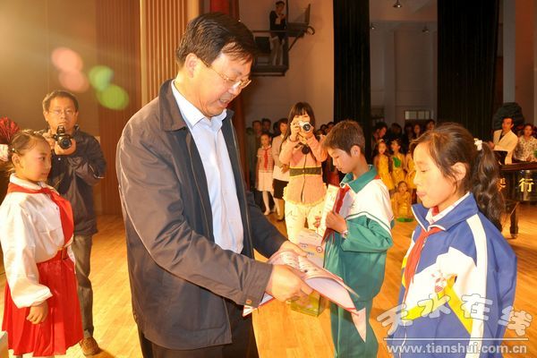 市領導郭奇若、楊繼軍、朱政英、王鳳保出席活動并為獲留守兒童作文大賽和紅歌唱響天水歌詠比賽獎勵的少年兒童頒獎。