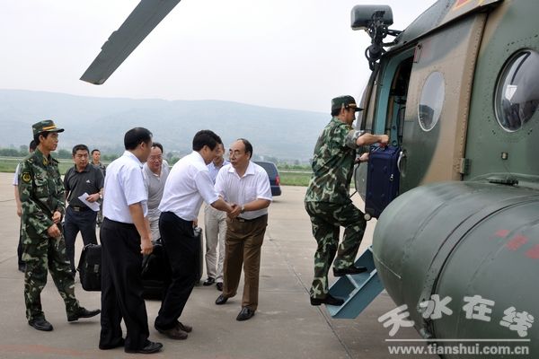 8月9日上午8時30分,國家有關(guān)部委20多位領(lǐng)導(dǎo)專家乘坐的兩架直升機從天水機場起飛,前往舟曲。但受舟曲局地天氣影響,直升機無法降落,1小時10分鐘后,兩架直升機返回天水機場。