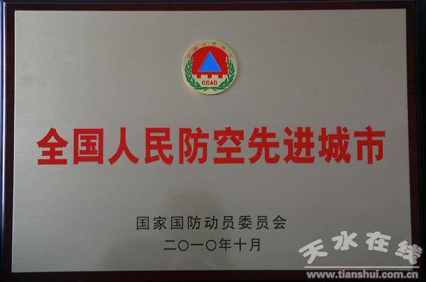 在第六次全國(guó)人民防空會(huì)議上,天水市被國(guó)家國(guó)防動(dòng)員委員會(huì)評(píng)為全國(guó)人民防空先進(jìn)城市,市人防辦主任任長(zhǎng)明同志被國(guó)家人民防空辦公室評(píng)為全國(guó)人民防空先進(jìn)個(gè)人。