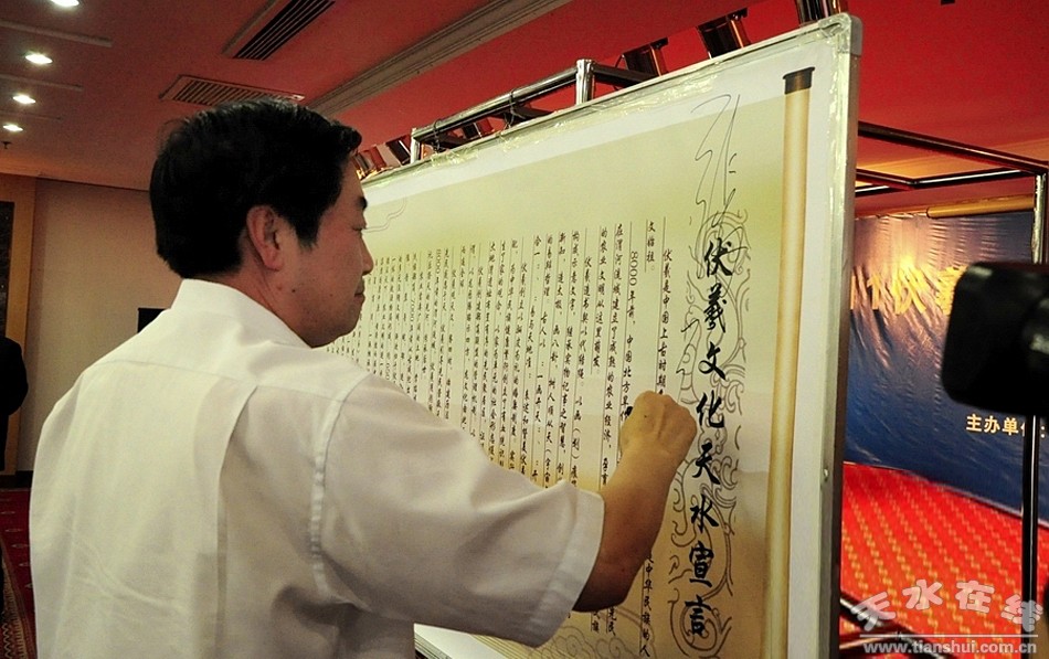 (省政協(xié)副主席、黨組副書記、中華伏羲文化研究會會長張津梁在《天水宣言》上簽字 )