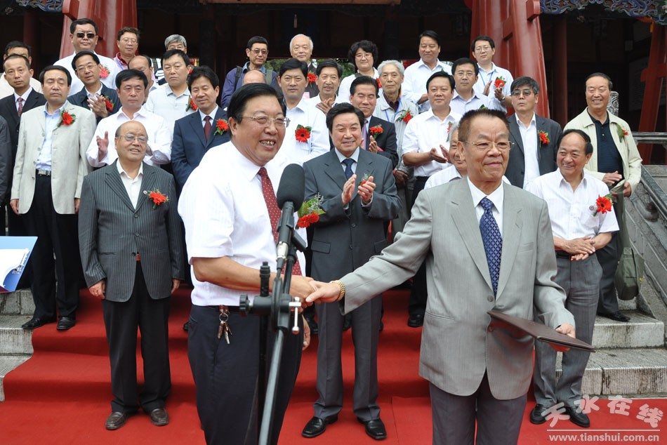 市人大常委會主任任伯年為伏羲學院特約教授代表、蘭州大學歷史文化學院博士生導師杜斗成教授頒發(fā)聘書