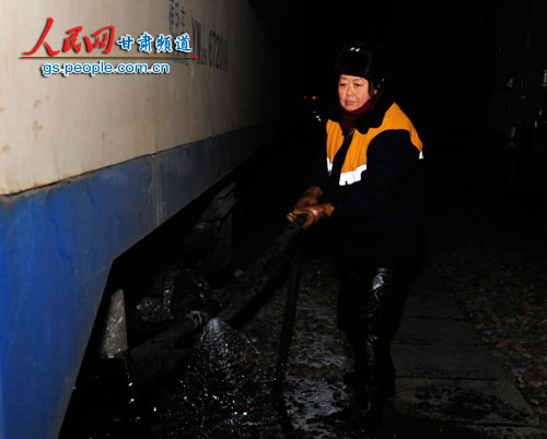 天水車站女子上水組上水工唐蓮枝正在給列車上水。(吳春玉 攝)