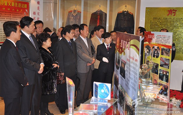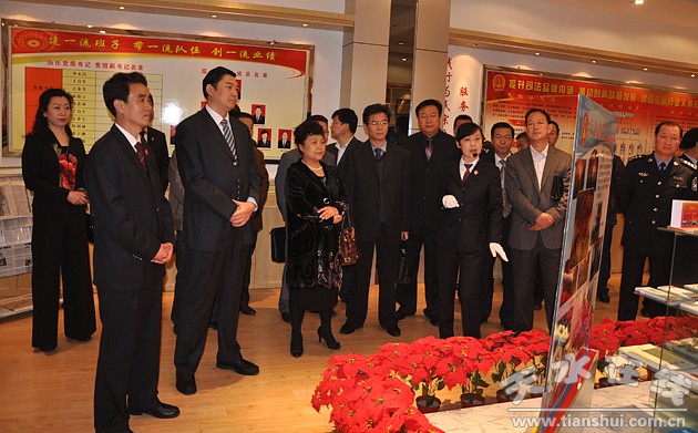 會(huì)議開(kāi)展前,市委常委、政法委書(shū)記趙衛(wèi)東一行先后參觀了市中院的文化長(zhǎng)廊、榮譽(yù)展廳、廉政宣教和法紀(jì)警示展板、文化墻和現(xiàn)代化審判庭,使全市政法系統(tǒng)全體人員對(duì)市中院的一些工作經(jīng)驗(yàn)有了初步直觀的了解。這些珍貴的紀(jì)實(shí)照片、實(shí)物以及不同創(chuàng)意的展板等,全面展現(xiàn)了法院的發(fā)展歷程,反映了市中級(jí)人民法院在班子建設(shè)、隊(duì)伍建設(shè)、能力建設(shè)、文化建設(shè)和制度建設(shè)等方面取得的顯著成效。
