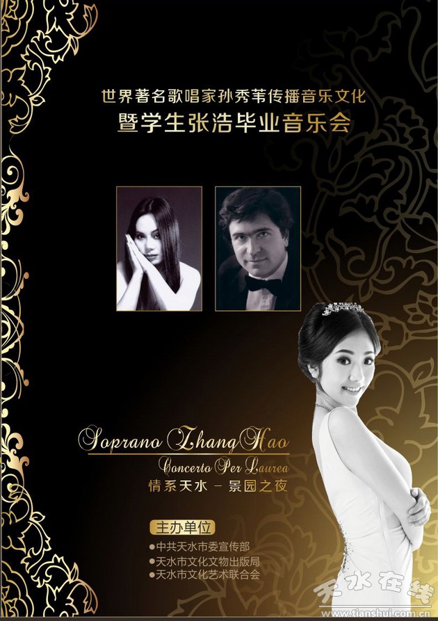 世界著名女高音歌唱家孫秀葦傳播音樂文化暨學生張浩畢業(yè)音樂會將于2012年5月5日晚8時在天水秦州劇院隆重舉辦,本活動由甘肅景園集團冠名贊助。