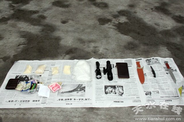 6月5日,按照天水市公安局的統(tǒng)一部署,由市公安局、交警支隊(duì)、武警支隊(duì)、麥積分局抽調(diào)民警組成的第五盤(pán)查組在麥積區(qū)潘集寨設(shè)卡盤(pán)查。下午16時(shí)10分,盤(pán)查組在對(duì)一輛掛陜A牌照的銀灰色現(xiàn)代轎車進(jìn)行檢查時(shí),發(fā)現(xiàn)車內(nèi)的三名男子形跡可疑,卡點(diǎn)民警立即對(duì)三名男子分組盤(pán)查。盤(pán)查中,其中兩名男子神色慌張,回答提問(wèn)相互矛盾,一名男子借口小便乘機(jī)跳入渭河渡河逃竄,盤(pán)查組民警在將其余兩名嫌疑人完全控制的同時(shí),對(duì)逃竄嫌疑人奮力追捕,16時(shí)30分許,追捕民警合力將逃竄嫌疑人成功抓獲。在對(duì)三名嫌疑人和嫌疑車輛的檢查中,當(dāng)場(chǎng)查獲冰毒及配料7包共540.734克、毒具2副、匕首2把,步槍標(biāo)準(zhǔn)鏡1副、強(qiáng)光手電1只、銀行卡6張、現(xiàn)金600余元。