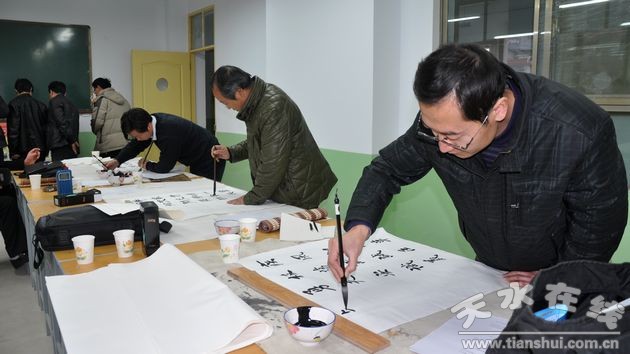 12月12日,天水市文聯(lián)組織市書協(xié)、美協(xié)部分知名書畫家一行15人,走進(jìn)天水市伏羲中學(xué)開展宣傳貫徹黨的十八大精神送文化進(jìn)校園活動(dòng)。 “三更燈火五更雞,正是男兒讀書時(shí)”、“少小多才學(xué),平生志氣高”……在筆會(huì)現(xiàn)場(chǎng),一幅幅勸學(xué)、勵(lì)志的書畫作品躍然紙上,讓師生感受到書畫藝術(shù)獨(dú)特的魅力。長(zhǎng)期以來,市文聯(lián)組織廣大文藝家深入全市各街道社區(qū)、部隊(duì)學(xué)校、企事業(yè)單位中,廣泛開展多種形式的文藝活動(dòng),使基層文化活動(dòng)得以如火如荼地開展。此次活動(dòng),為師生提供了一個(gè)便于學(xué)習(xí)交流的橋梁和紐帶。