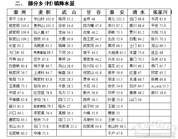 受北方下滑冷空氣和副熱帶高壓外圍暖濕氣流的共同影響,7日夜間開始我市出現(xiàn)大范圍強(qiáng)降雨天氣,截止8日20時,除武山、甘谷外,其余縣區(qū)均出現(xiàn)暴雨,最大降水量出現(xiàn)在秦安縣的灣兒村,達(dá)132.3毫米。