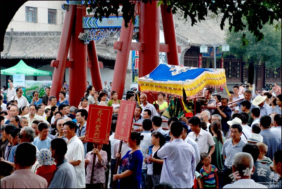 相傳農(nóng)歷七月十九日是伏羲氏仙逝紀念日,其祭祀活動由“上元會”組織當?shù)厝罕娕e行祭祀儀式,邀請當?shù)厍厍粦虬喑獟煲聭蛉欤漓氤绦蜉^為簡單。2009年始,為了搞好國家級非物質(zhì)文化遺產(chǎn)保護項目—太昊伏羲祭典的保護傳承和伏羲文化的研究,天水博物館倡議,請熱心伏羲文化研究的仁人志士籌備申請成立“天水市民間祭祀伏羲協(xié)會”,擴大祭祀影響,逐漸恢復傳承歷史秋祭典禮。自此,祭祀活動由天水市民間祭祀伏羲協(xié)會(籌)、天水市博物館和“上元會”共同組織實施秋季伏羲典禮,其規(guī)格、規(guī)模和程序均參照春祭活動進行,時間從農(nóng)歷七月十八日至七月二十日,為期三天。農(nóng)歷七月十八日上午9:00時(具體時間按當日民俗喜神當值方位和時間確定),舉行迎神、安神、出榜文儀式;農(nóng)歷七月十九日上午8:00 時,迎供獻飯,9:50正式祭祀;農(nóng)歷七月二十日午場戲尾聲,舉行送神儀式;顒悠陂g,邀請秦腔劇團公演秦腔劇目。秋祭伏羲活動中的請神、安神、迎獻飯等儀式和春祭活動基本相似,但取圣水儀式是根據(jù)每年龍王治水風俗而定。