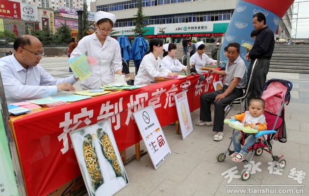 2014年5月31日是第27個“世界無煙日”。為了進(jìn)一步引起社會對煙草危害人類健康的重視,在民眾中普及煙草危害知識教育,使全社會共同參與到戒煙控?zé)熁顒又衼,天水市衛(wèi)生局、市愛衛(wèi)辦、市健教所組織市第一人民醫(yī)院、市第三人民醫(yī)院、市中醫(yī)醫(yī)院、市婦幼保健院、市衛(wèi)生局衛(wèi)生監(jiān)督所、市疾病預(yù)防控制中心、市中心血站、四O七醫(yī)院等8家醫(yī)療衛(wèi)生單位在龍城廣場開展了控?zé)熃麩熜麄骰顒印?
