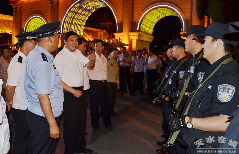 6月21日晚,天水市委常委、政法委書(shū)記趙衛(wèi)東帶領(lǐng)市公安局、市武警支隊(duì)、市消防支隊(duì)、市信訪局及市綜治辦、維穩(wěn)辦等相關(guān)部門(mén)負(fù)責(zé)同志,深入伏羲廣場(chǎng)、伏羲廟及來(lái)賓駐地賓館飯店,檢查節(jié)會(huì)安保各項(xiàng)措施落實(shí)情況。 市政府黨組成員、市公安局局長(zhǎng)黃金奎一同檢查。