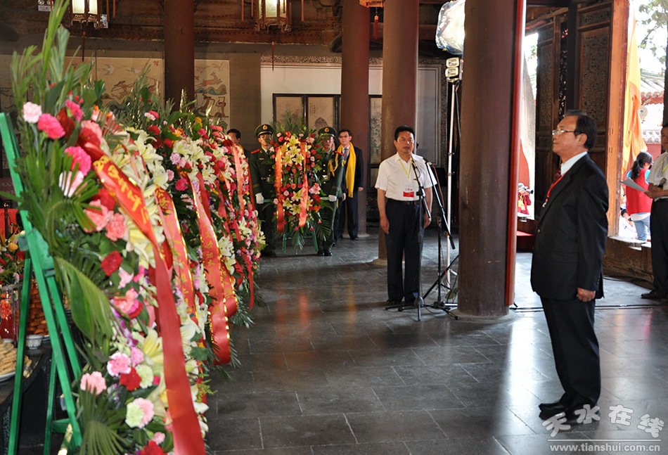 2014(甲午)年甘肅省公祭中華人文始祖伏羲大典于6月22日上午9時50分在天水市伏羲祭祀廣場隆重舉行。圖為寧夏回族自治區(qū)人民政府副秘書長崔曉華代表全國兄弟省、市、自治區(qū)向伏羲圣像敬獻花籃。