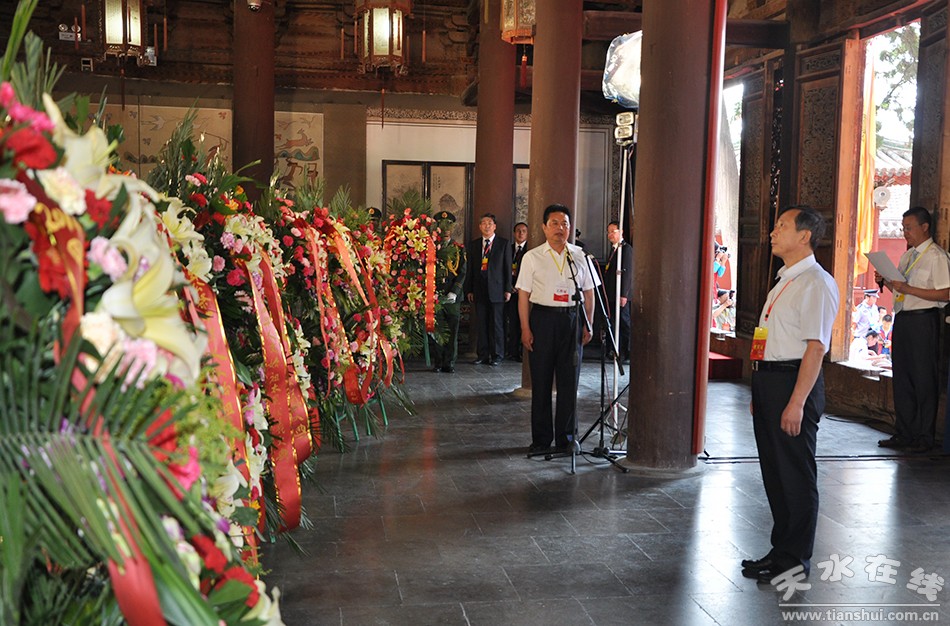 2014(甲午)年甘肅省公祭中華人文始祖伏羲大典于6月22日上午9時50分在天水市伏羲祭祀廣場隆重舉行。圖為中共甘肅省委書記、省人大常委會主任王三運向伏羲圣像敬獻花籃。