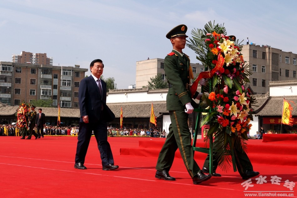 2014(甲午)年甘肅省公祭中華人文始祖伏羲大典于6月22日上午9時50分在天水市伏羲祭祀廣場隆重舉行。圖為中共甘肅省委副書記、省長劉偉平向伏羲圣像敬獻花籃。