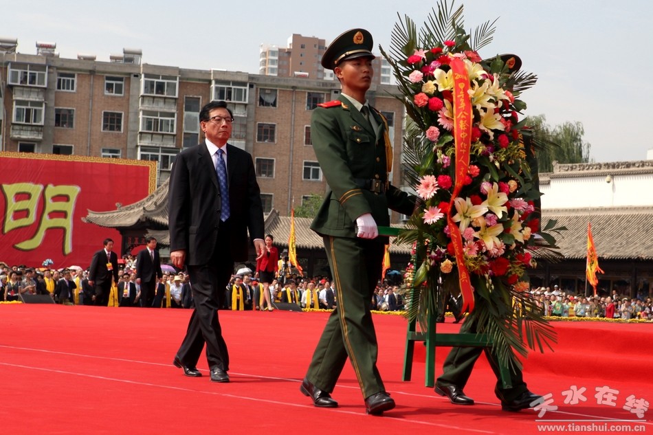 2014(甲午)年甘肅省公祭中華人文始祖伏羲大典于6月22日上午9時50分在天水市伏羲祭祀廣場隆重舉行。圖為中國國民黨中評會主席團主席李總集向伏羲圣像敬獻花籃。
