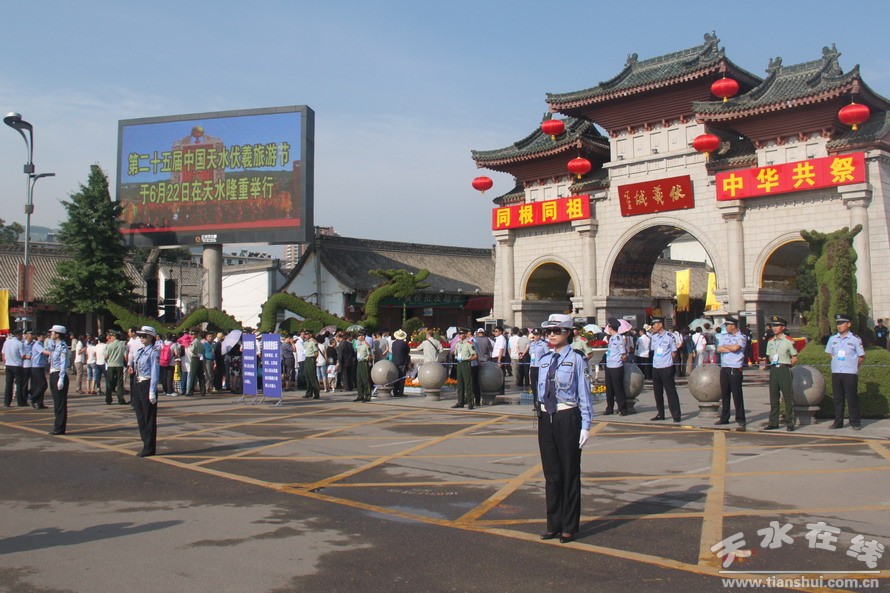 2014(甲午)年公祭中華人文始祖伏羲大典于6月22日上午9時(shí)50分在天水伏羲祭奠廣場(chǎng)舉行,此次活動(dòng)級(jí)別高,參加活動(dòng)的國(guó)家、省、市領(lǐng)導(dǎo)以及海內(nèi)外嘉賓多,交通安全保障任務(wù)艱巨。為保障接送來(lái)賓車輛在天水轄區(qū)安全、暢通,天水交警根據(jù)甘肅省公安廳交管局及天水市公安局的統(tǒng)一安排部署, 組織340余名警力開(kāi)展慶典交通保障。全體參戰(zhàn)民警全力以赴,眾志成城,發(fā)揮連續(xù)作戰(zhàn)的精神,圓滿完成了2014年公祭中華人文始祖伏羲大典活動(dòng)交通安全保障任務(wù)。