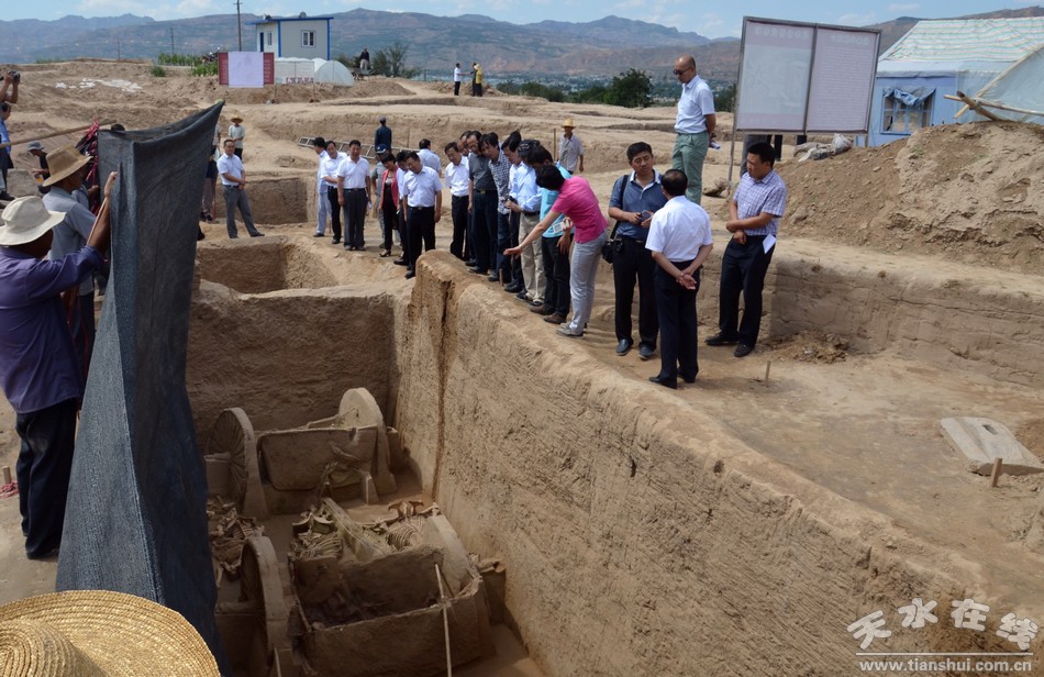 毛家坪遺址位于甘谷縣磐安鎮(zhèn)毛家坪村,現(xiàn)為省級(jí)文物保護(hù)單位。面積約60萬(wàn)平方米,遺址保存比較完整。2012至2014年,累計(jì)發(fā)掘遺址面積約4000平方米,共清理春秋、戰(zhàn)國(guó)時(shí)期的大小墓葬199座、灰坑752個(gè),出土陶器、石器、玉器、青銅器、骨器等各類文物近2000件,其中出土鼎、簋 、方壺、甗 、孟、敦 、盤、匜等青銅容器51件,出土短劍、戈、矛等青銅兵器11件,發(fā)掘車馬坑5座,發(fā)掘大型墓葬兩座。目前,墓地發(fā)掘工作基本結(jié)束。此次發(fā)掘出土的青銅器、銘文、車馬坑和大量實(shí)物資料,開創(chuàng)了考古學(xué)上探索早期秦文化的先河,極大地豐富了甘肅東部秦文化的內(nèi)涵,對(duì)進(jìn)一步探討嬴秦西遷的時(shí)間、路線提供了實(shí)物資料,更對(duì)研究甘谷乃至渭河上游古代民族分布、生活以及民族融合過(guò)程,豐富發(fā)展地域文化,開發(fā)打造旅游景點(diǎn),提升縣域知名度具有里程碑式的意義。