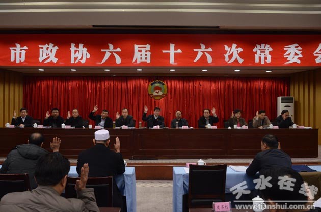 12月30日下午,天水市政協(xié)召開六屆十六次常委會。市委副書記、市政協(xié)主席宋尚有主持會議并強調(diào),市政協(xié)常委會組成人員要認真貫徹落實中共十八大和黨的十八屆三中、四中全會及習(xí)近平總書記系列講話精神,以全面深化改革為動力,積極有效地履行政治協(xié)商、民主監(jiān)督、參政議政職能,為推動天水經(jīng)濟社會轉(zhuǎn)型跨越發(fā)展作出新的貢獻。