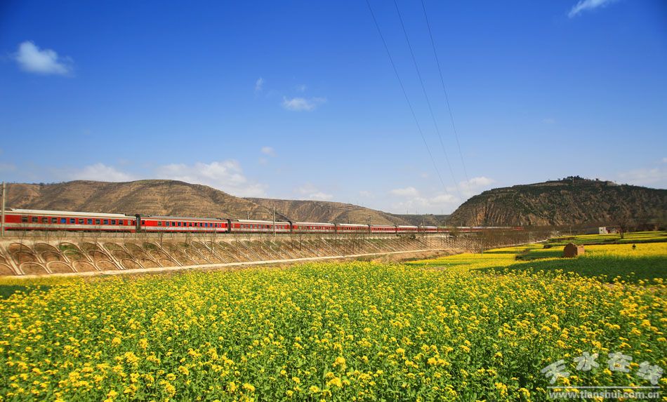 2015年04月05日,清明節(jié),天水卦臺(tái)山下,油菜花盛開,迎接開往春天的列車。想必列車上的旅客看到此情此景,心情一定“美美噠”!。