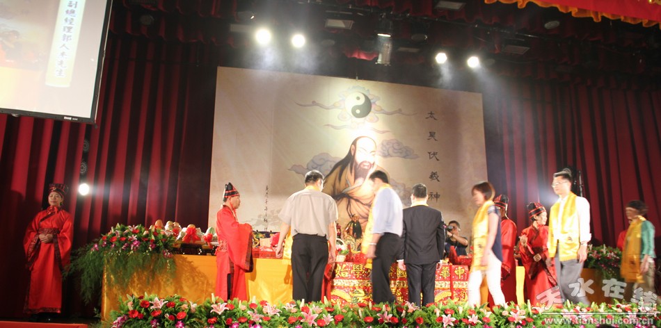 天水在線6月22日臺灣報道 同根同祖、兩岸共祭。這里是臺灣臺北市中影八德大樓禮堂,今天在這里舉行的海峽兩岸共祭人文始祖伏羲典禮,與天水伏羲廟的公祭同步進行。臺灣各界人士和甘肅省伏羲文化赴臺交流團成員近千人共襄盛舉,同祭伏羲。