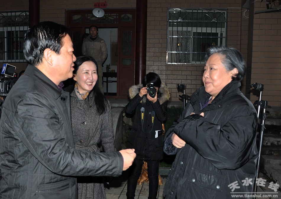 11月8日下午,天水市委副書(shū)記、市長(zhǎng)楊維俊在麥積區(qū)麥積鎮(zhèn)紅崖村調(diào)研精準(zhǔn)扶貧工作時(shí),再次看望了正在該村拍攝電視劇《苦樂(lè)村官》的演職人員。圖為天水市委副書(shū)記、市長(zhǎng)楊維俊與該劇主演、著名演員斯琴高娃親切交談。