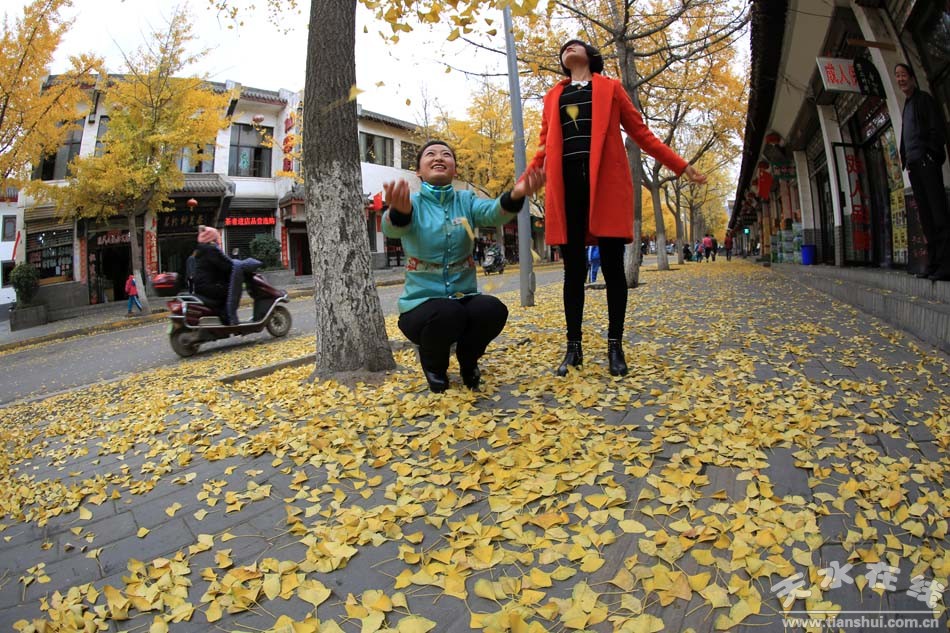 天水在線報(bào)道 11月18日中午,秦州區(qū)青年北路銀杏樹(shù)上金黃的樹(shù)葉從枝頭飄落,旋轉(zhuǎn)著身軀,緩緩躺在路面上,像完成一次完美的慢動(dòng)作跳水。落葉遍地,景美如畫(huà),“天水黃”成為天水城一道亮麗的風(fēng)景,不少市民在如詩(shī)如畫(huà)的景色中享受大自然。