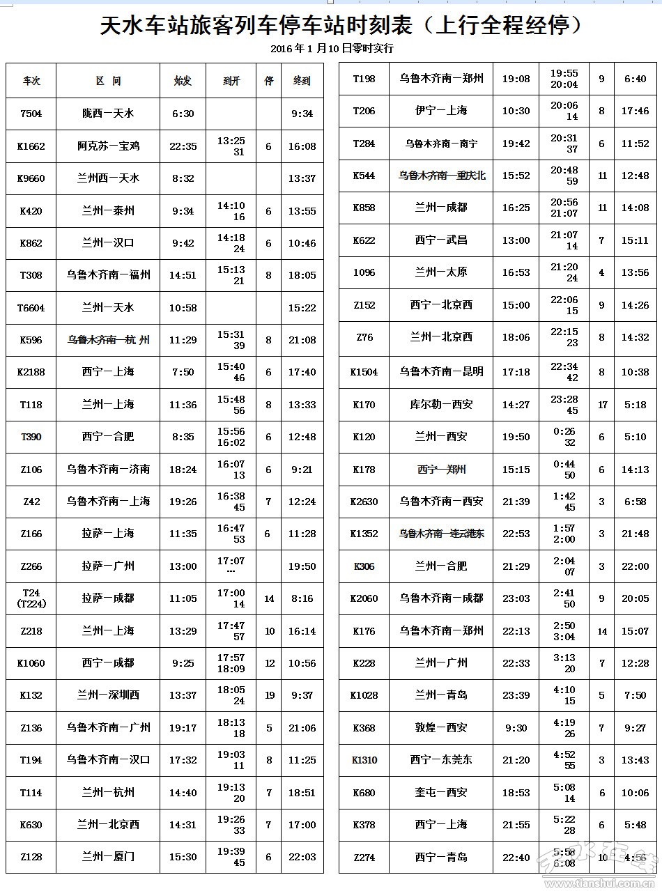 天水車(chē)站旅客列車(chē)停車(chē)站時(shí)刻表(2016年1月10日實(shí)行)