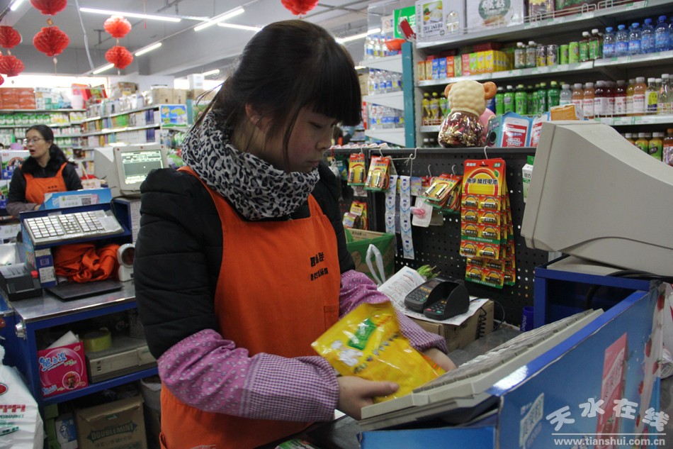 (圖為四海聯(lián)超市導(dǎo)購員董瑾平大年初一仍在工作)