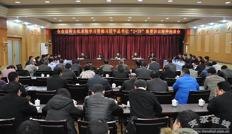 2月23日下午,全市宣傳文化系統(tǒng)學(xué)習(xí)貫徹習(xí)近平總書記“2.19”重要講話精神座談會在天水迎賓館召開。市委常委、宣傳部長王正茂強(qiáng)調(diào),全市宣傳文化系統(tǒng)特別是新聞戰(zhàn)線要牢固樹立政治意識、大局意識、核心意識、看齊意識,學(xué)習(xí)宣傳貫徹落實(shí)好習(xí)近平總書記重要講話精神,切實(shí)提高黨的新聞輿論傳播力、引導(dǎo)力、影響力和公信力,推動習(xí)近平總書記講話精神在我市新聞輿論戰(zhàn)線落地生根,變成普遍實(shí)踐。