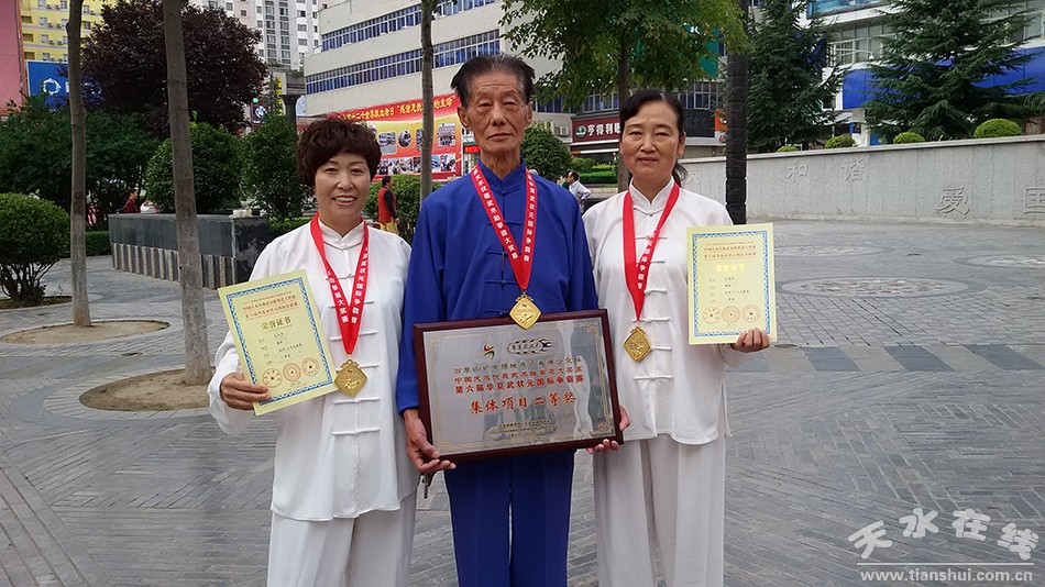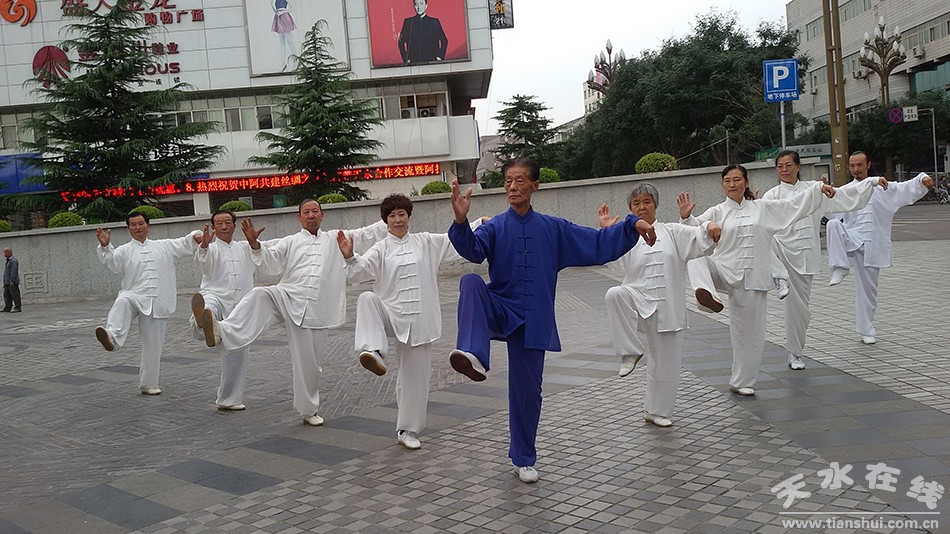 每天清晨,在天水龍城廣場的西北角活躍著一支由一名鶴發(fā)銀絲、精神矍鑠的老者帶領(lǐng)的太極拳愛好者隊(duì)伍,——龍城太極拳隊(duì),這位老者就是天水市武協(xié)顧問、國家一級社會體育指導(dǎo)員、中國武術(shù)協(xié)會會員、中國武術(shù)六段、優(yōu)秀裁判員金獎(jiǎng)、天水市老年大學(xué)第一任拳劍教師蒲健老師。太極拳隊(duì)在蒲老師的帶領(lǐng)下一會兒如細(xì)風(fēng)拂柳、追影逐形,一會兒接轉(zhuǎn)開合,快慢相間,無論伸縮開合,或收放來去,吞吐含化,都圓潤如珠、松而不懈、慢而不滯,活而不散,式式連綿不斷,每個(gè)動作由內(nèi)達(dá)外皆展示著太極深厚的文化底蘊(yùn),傳遞著太極獨(dú)特之美。常常有路過的群眾不由自主加入到晨練的隊(duì)伍中。