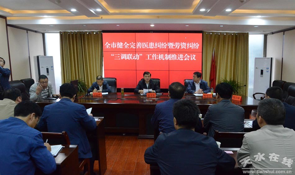 會議宣讀了《天水市健全完善勞資糾紛三調(diào)聯(lián)動工作機(jī)制指導(dǎo)意見》和《天水市健全完善醫(yī)患糾紛三調(diào)聯(lián)動工作機(jī)制指導(dǎo)意見》,市人社局、市衛(wèi)計局、市中級人民法院等相關(guān)部門負(fù)責(zé)人作了發(fā)言。