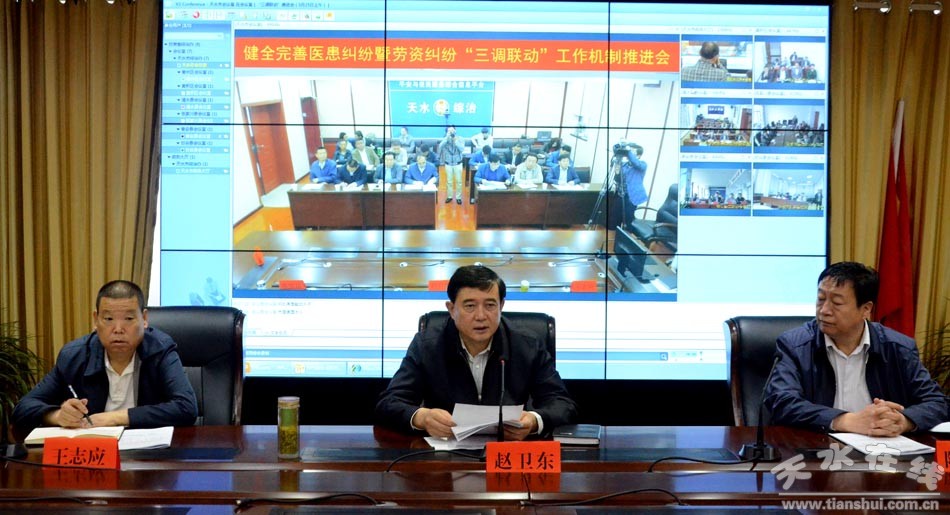 5月25日,市委常委、政法委書記趙衛(wèi)東主持召開全市健全完善醫(yī)患糾紛暨勞資糾紛“三調(diào)聯(lián)動(人民調(diào)解、司法調(diào)解、行政調(diào)解)”工作機(jī)制推進(jìn)會議,就健全完善我市醫(yī)患糾紛暨勞資糾紛領(lǐng)域“三調(diào)聯(lián)動”工作機(jī)制作了全面安排部署。