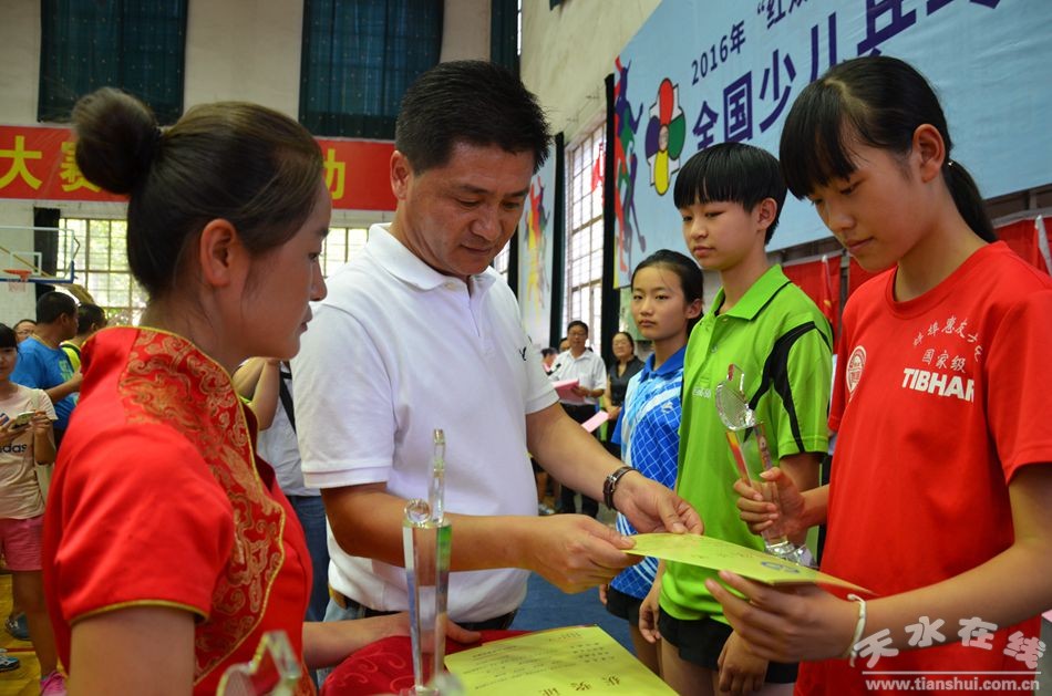 8月3日,2016年“紅雙喜·天水花牛蘋果·向陽(yáng)杯”全國(guó)少兒乒乓球比賽在天水師院閉幕。天水市參賽的各代表隊(duì)在比賽中榮獲多個(gè)獎(jiǎng)項(xiàng),其中天水市晶星青少年乒乓球俱樂部的孟繁碩奪得男子少年組第一名,甘肅天麟房地產(chǎn)開發(fā)集團(tuán)代表隊(duì)榮獲男子少年組團(tuán)體第一。