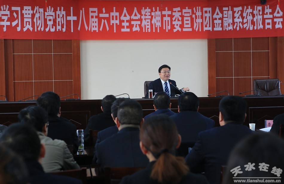 12月13日,天水市委宣講團(tuán)成員,市委常委、副市長(zhǎng)李曉東為全市金融系統(tǒng)干部職工宣講黨的十八屆六中全會(huì)精神。市政府副秘書長(zhǎng)李多江主持報(bào)告會(huì),市金融辦,人行天水市中心支行、天水銀監(jiān)分局及駐市銀行、保險(xiǎn)、證券等單位共計(jì)130余人聆聽了報(bào)告會(huì)。