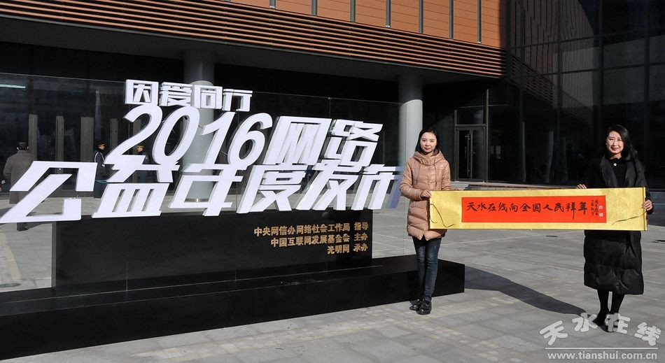 天水在線北京報(bào)道 1月12日下午,由中央網(wǎng)信辦網(wǎng)絡(luò)社會(huì)工作局指導(dǎo),中國(guó)互聯(lián)網(wǎng)發(fā)展基金會(huì)主辦,光明網(wǎng)承辦的“因愛同行”2016網(wǎng)絡(luò)公益年度發(fā)布在北京隆重舉行,天水在線因“互聯(lián)網(wǎng)+扶貧”榮獲“2016年網(wǎng)絡(luò)公益項(xiàng)目”大獎(jiǎng)。圖為1月12日晚中央電視臺(tái)《新聞聯(lián)播》播出的頒獎(jiǎng)新聞畫面,圖中右一為天水在線工作人員在領(lǐng)獎(jiǎng)。