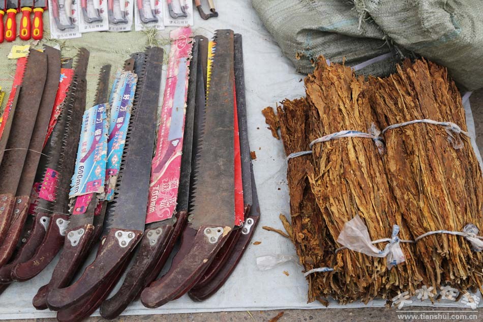 種類繁多的山貨市場可不只有這些編織類農(nóng)用物品,鐵制品在農(nóng)民生活中也是重頭戲。各式各樣的鋤頭、鐵鏟、鐮刀、草耙等整齊地擺放在地上,從莊家前期除草、碎土,到后期種耕,再到最后收獲等,一系列種地過程中所需的工具齊聚一堂,任由挑選?匆娺@些工具仿佛看見了一望無際的田地,在暖陽中只待農(nóng)民伯伯悉心呵護(hù)。