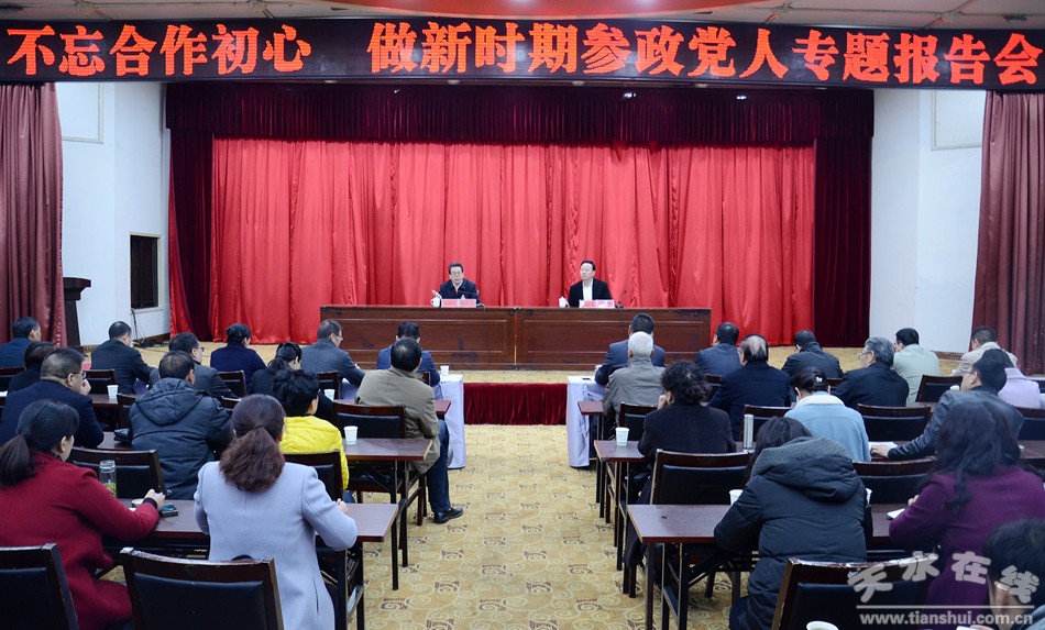 3月26日,天水市委統(tǒng)戰(zhàn)部在天水迎賓館舉辦“不忘合作初心,繼續(xù)攜手前進(jìn)”大宣講系列活動(dòng)。省政協(xié)常委、省民建專(zhuān)職副主委楊貴言應(yīng)邀為全市統(tǒng)一戰(zhàn)線(xiàn)廣大成員作“不忘合作初心,做新時(shí)期參政黨人”首場(chǎng)專(zhuān)題報(bào)告。