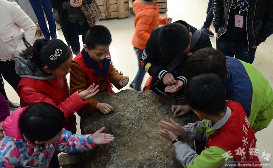 授牌儀式結(jié)束后,小記者們懷著美好而好奇的心情,在講解員的帶領(lǐng)下走進(jìn)博物館。剛進(jìn)大門,小記者就被一具長(zhǎng)7米,高2米的沱江龍化石(復(fù)制品)吸引。“哇,它背上的15對(duì)骨板好帥呀!”“老師,他尾巴末端為什么有兩對(duì)向上揚(yáng)起的骨頭?”小記者一邊看,一邊向講解員提問(wèn),待老師回答后還不忘認(rèn)真地記錄下來(lái)。小記者就這樣跟隨講解員的腳步,參觀完了古生物標(biāo)本、礦物標(biāo)本、巖石標(biāo)本等展廳,每一個(gè)展廳都洋溢著小記者驚奇、興奮的笑臉。走出博物館,小記者們又來(lái)到正在修建的地質(zhì)園,地質(zhì)文化長(zhǎng)廊以獨(dú)特的石類展覽和地質(zhì)科普為載體,從地球的地質(zhì)構(gòu)造、地貌概況出發(fā),演繹了巖石進(jìn)化各階段、各層次的發(fā)展過(guò)程,以龐大的氣魄和博、精、巨、奇的姿態(tài)全方位、全角度地揭示了地球的內(nèi)涵奧秘和大自然的神奇態(tài)勢(shì),讓小記者流連忘返。