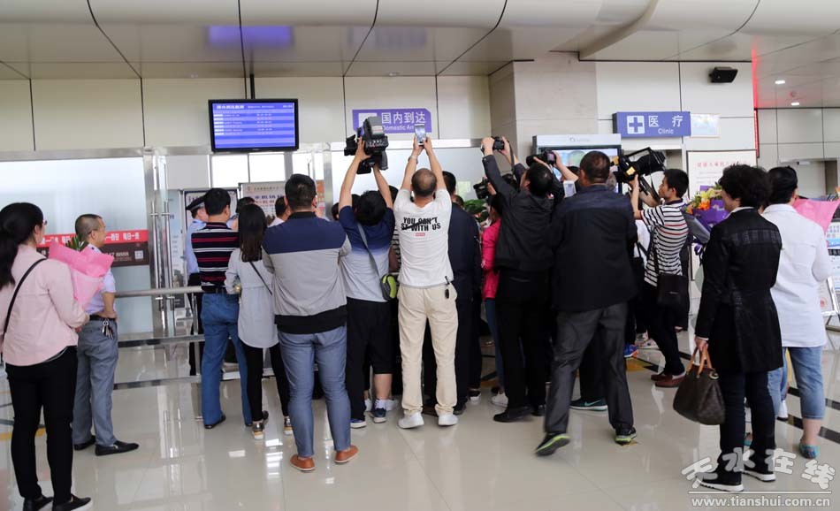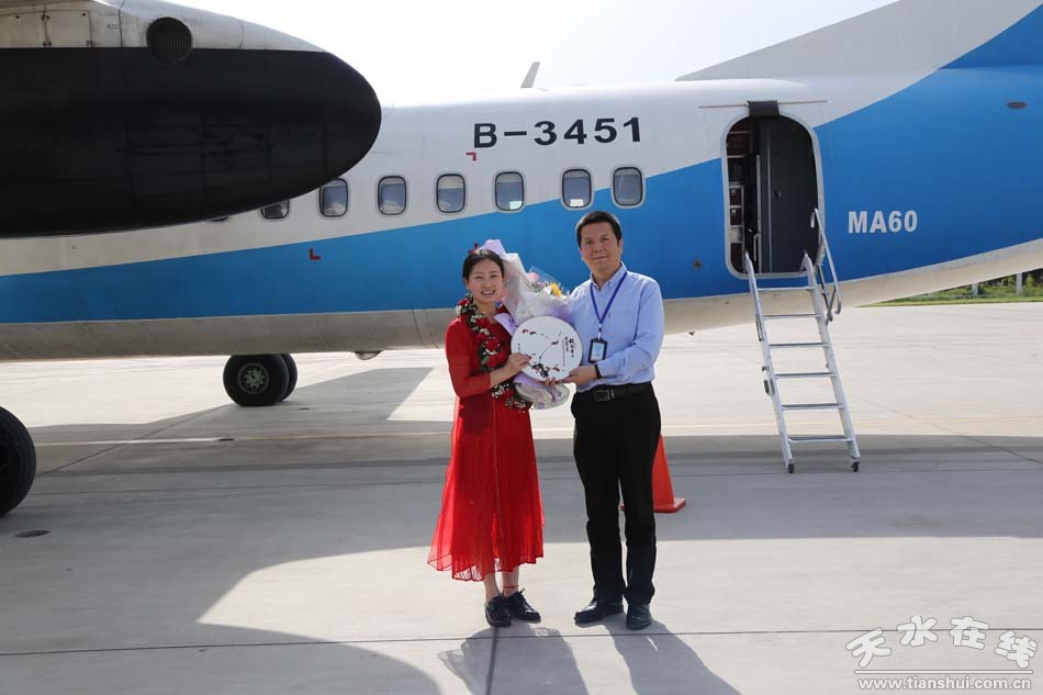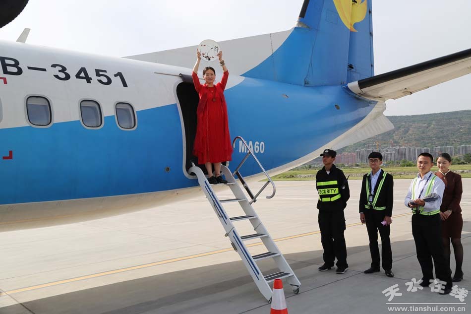 天水在線快訊 五月的天水,繁花似錦;五月的天水,櫻桃飄香。5月24日16時(shí)50分,隨著從西安飛來(lái)的JR1539航班穩(wěn)穩(wěn)的停在天水機(jī)場(chǎng)停機(jī)坪,剛剛榮獲中國(guó)戲劇最高獎(jiǎng)——第28屆中國(guó)戲劇梅花獎(jiǎng)的國(guó)家一級(jí)演員、中國(guó)秦腔“四小名旦”、天水市西秦腔研究院副院長(zhǎng)袁丫丫面帶微笑,手捧“梅花獎(jiǎng)”走下飛機(jī)舷梯。隨即,天水市西秦腔研究院院長(zhǎng)董秦,天水在線、天水新天視演出有限公司、天水菜籃子集團(tuán)等的有關(guān)人員送上鮮花、送上擁抱,感謝袁丫丫為天水贏得榮譽(yù),歡迎袁丫丫載譽(yù)歸來(lái)。
