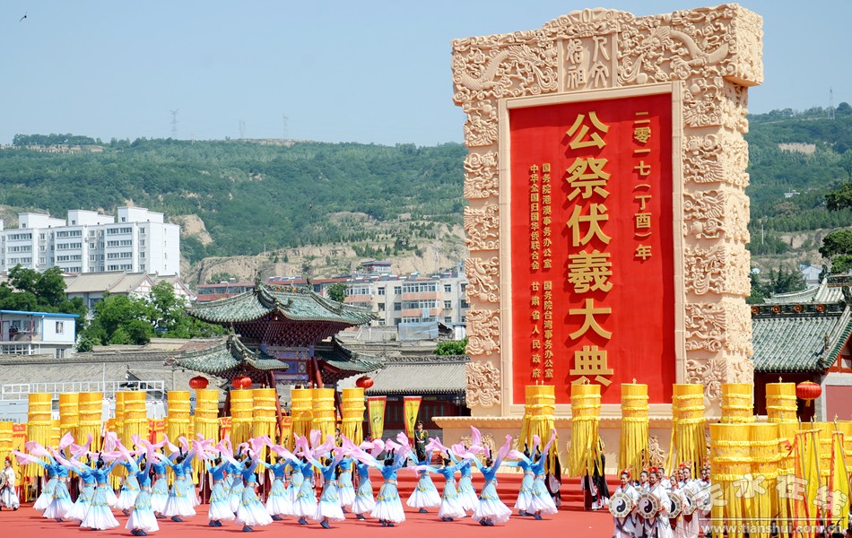6月22日上午9時(shí)50分,在天水伏羲廟和臺灣臺北市同步舉行了主題為“傳承伏羲文化 弘揚(yáng)中華文明”的2017(丁酉)年公祭中華人文始祖伏羲大典,這是第四次海峽兩岸共祭伏羲,表達(dá)了全體中華兒女對人文始祖伏羲創(chuàng)世功績的崇高敬仰和無限尊崇。